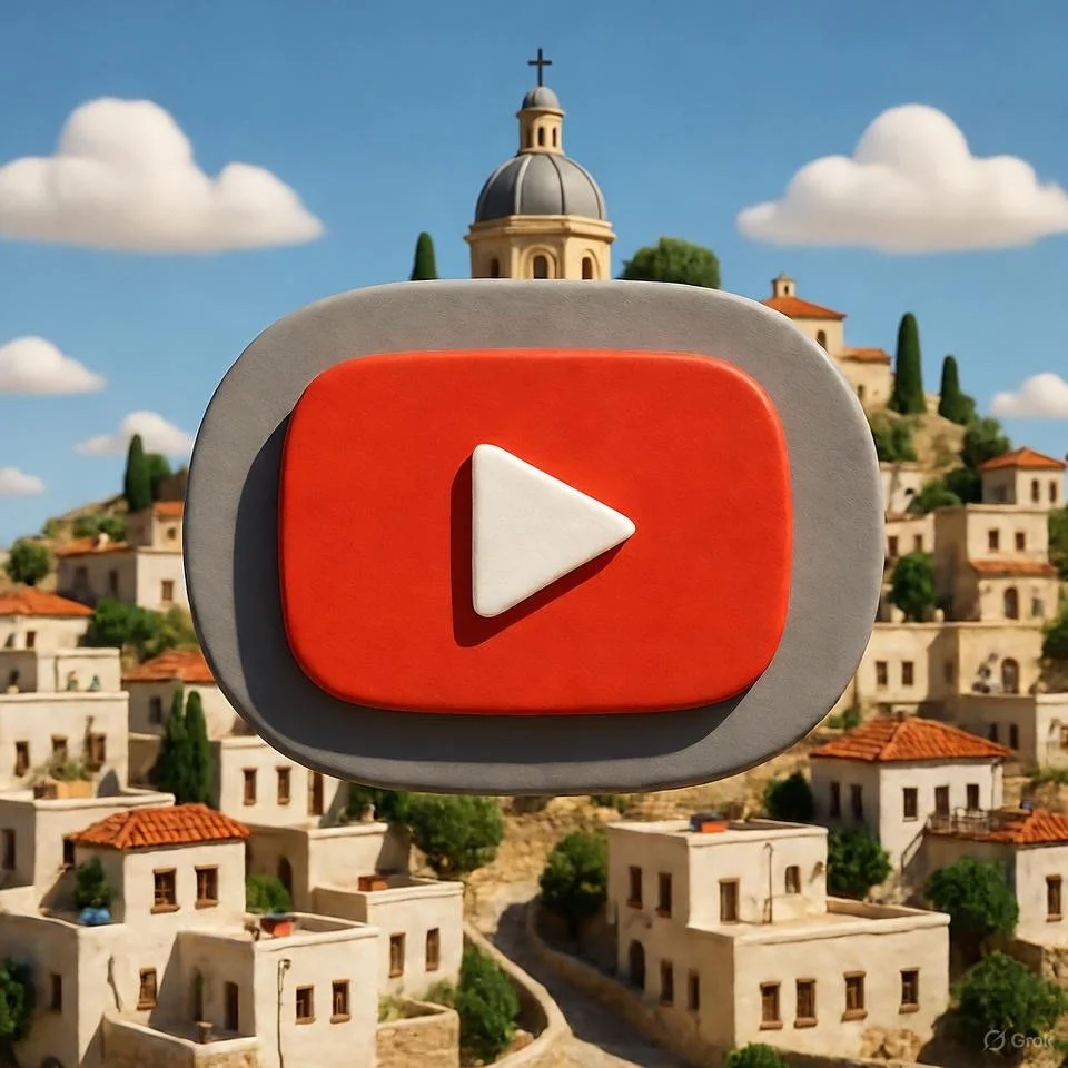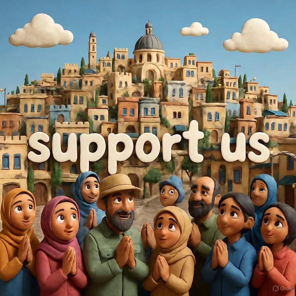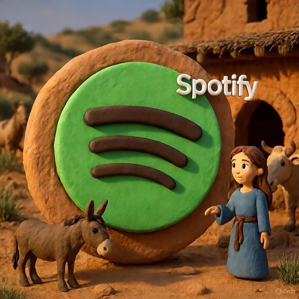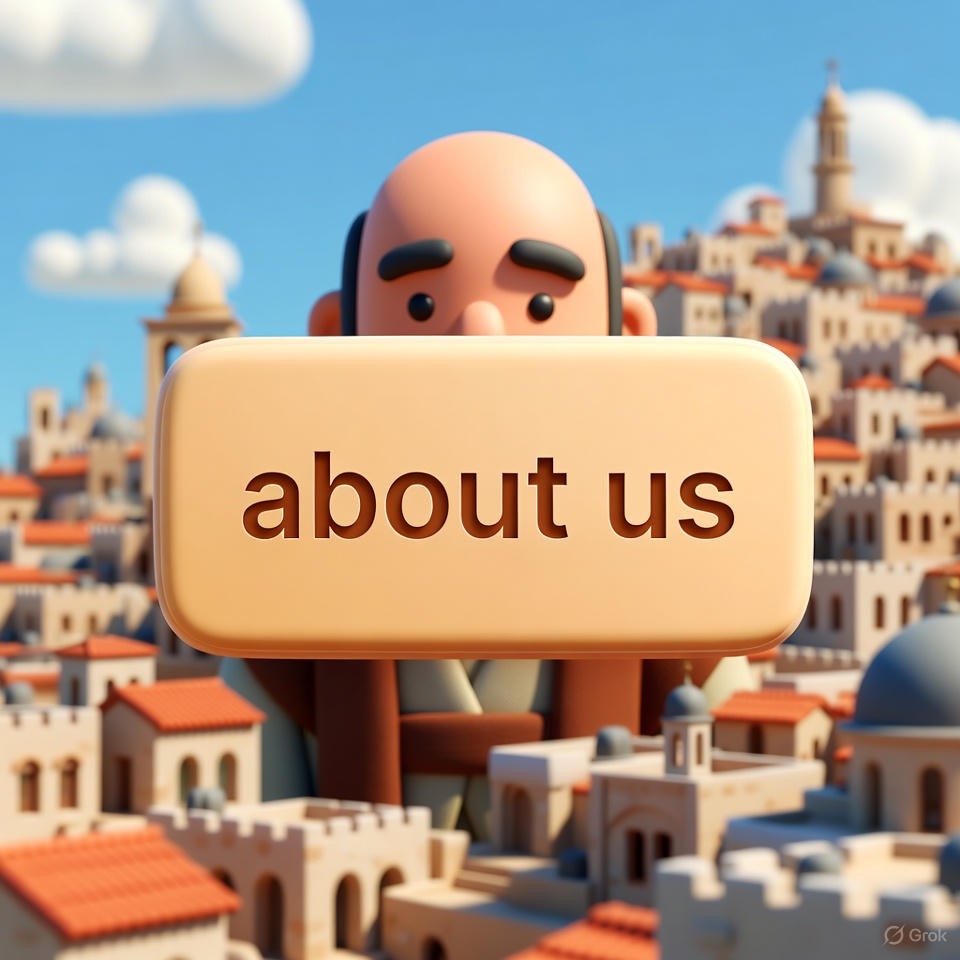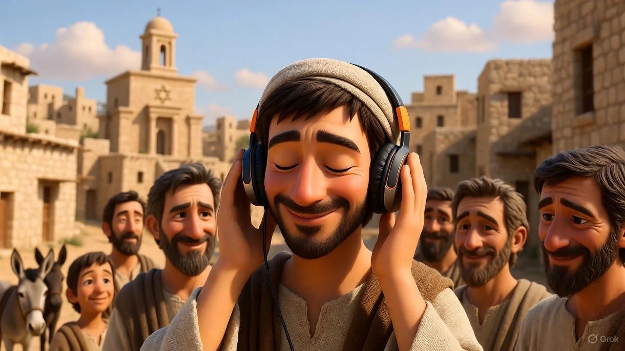 Animated scene of several men in biblical attire in an ancient village, with a young man in the foreground smiling while listening to headphones, surrounded by others who are smiling and a donkey, with old stone buildings and a church in the background.